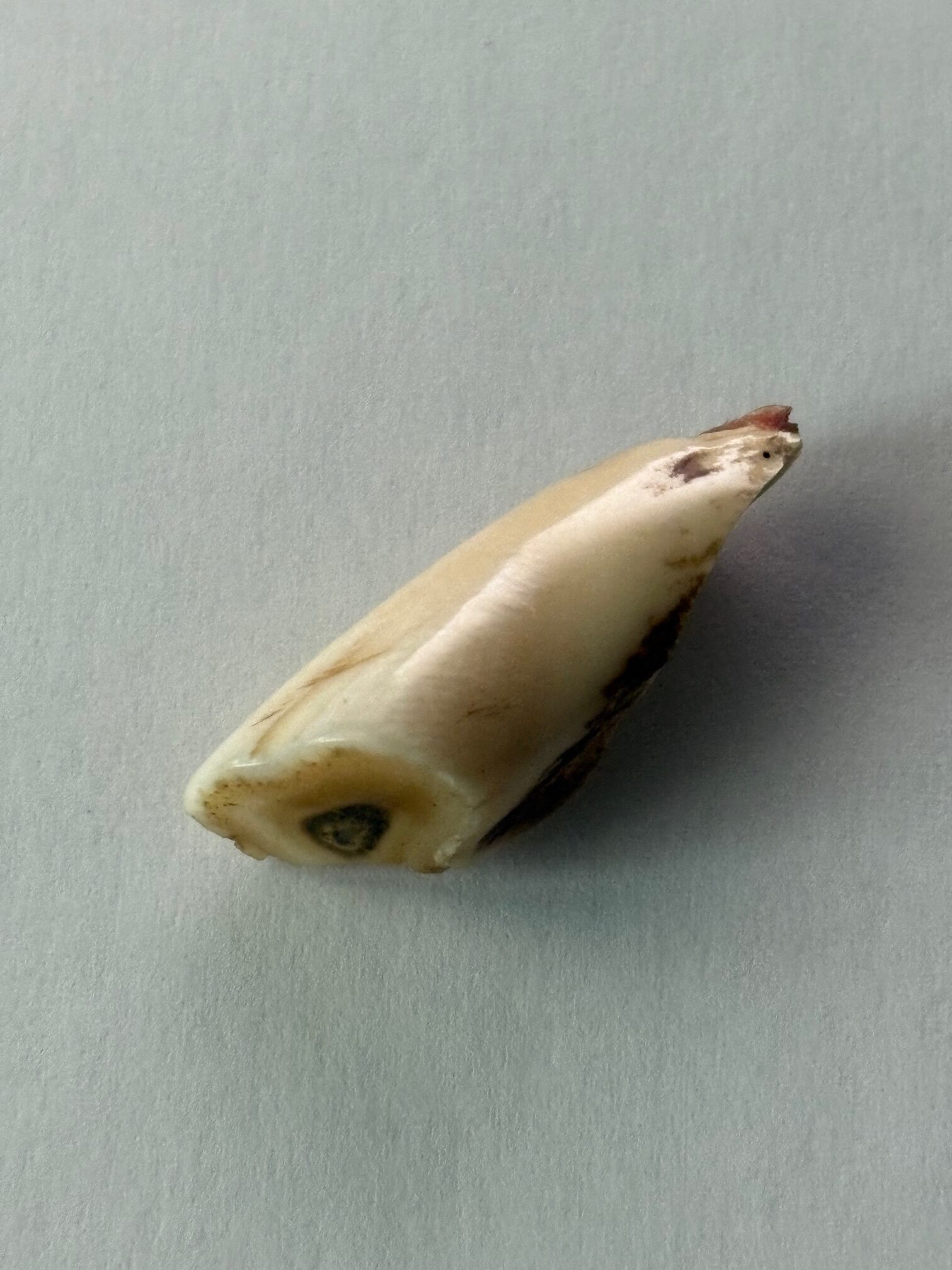 Der Schneidezahn war bis zur Pulpa (Zahnmark) abgebrochen. Eine ernste Sache, denn so etwas kann schnell recht schmerzhaft werden und zu Entzündungen bzw. Fressunlust führen.